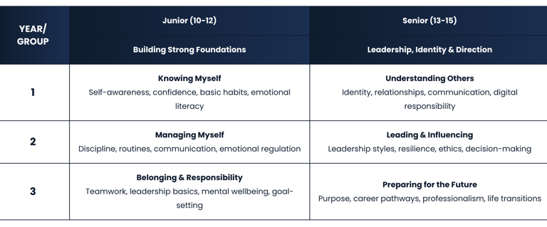 The character & life skills (CLS) curriculum is organised according to the two age groups, 10 - 12 and 13 - 15, each spanning three years and comprising 30 unique sessions. While similar themes may appear across age groups, they are deliberately differentiated to be age-appropriate, increasingly sophisticated, and never repetitive for an individual learner.
